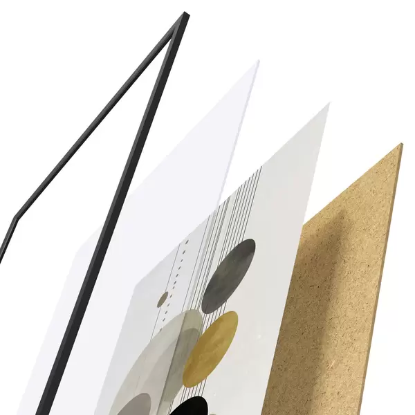 De poster bestaat uit een frame, plexiglas, geprinte afbeelding en spaanplaat achterkant. De poster kan meteen aan de muur worden gehangen dankzij de bevestigingen op de achterkant.