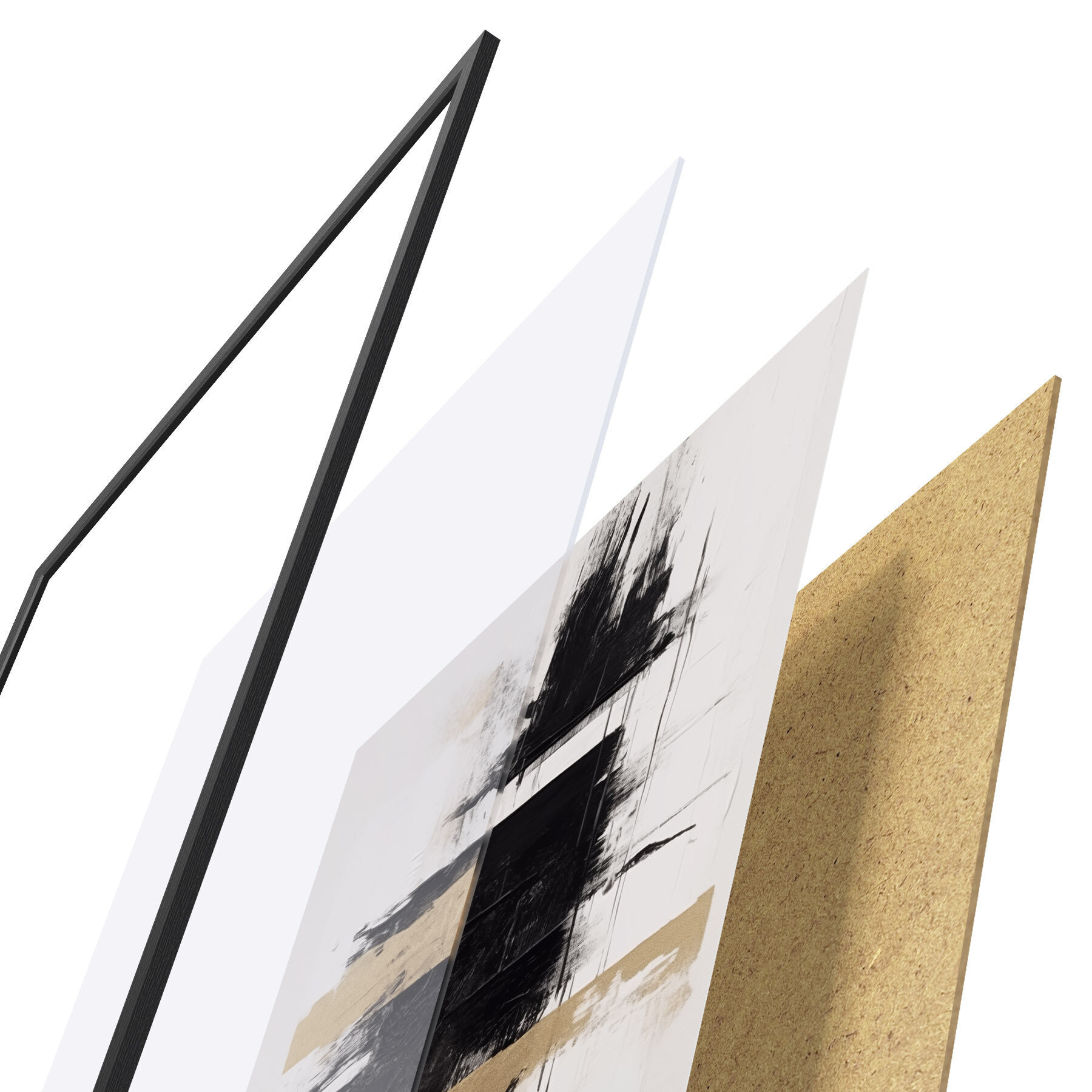 De poster bestaat uit een frame, plexiglas, geprinte afbeelding en spaanplaat achterkant. De poster kan meteen aan de muur worden gehangen dankzij de bevestigingen op de achterkant.