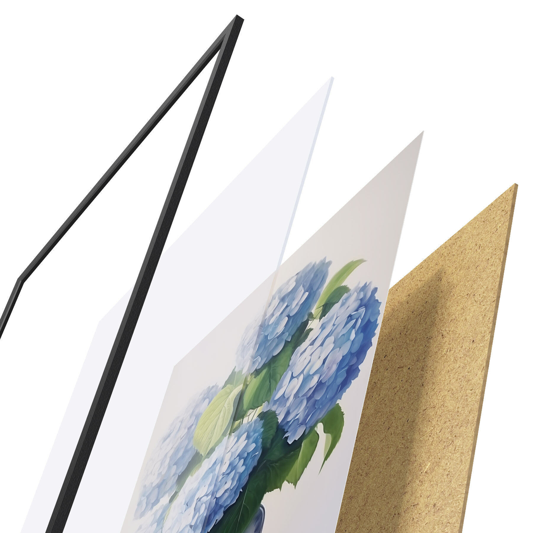 De poster bestaat uit een frame, plexiglas, geprinte afbeelding en spaanplaat achterkant. De poster kan meteen aan de muur worden gehangen dankzij de bevestigingen op de achterkant.