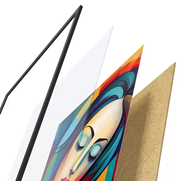 De poster bestaat uit een frame, plexiglas, geprinte afbeelding en spaanplaat achterkant. De poster kan meteen aan de muur worden gehangen dankzij de bevestigingen op de achterkant.
