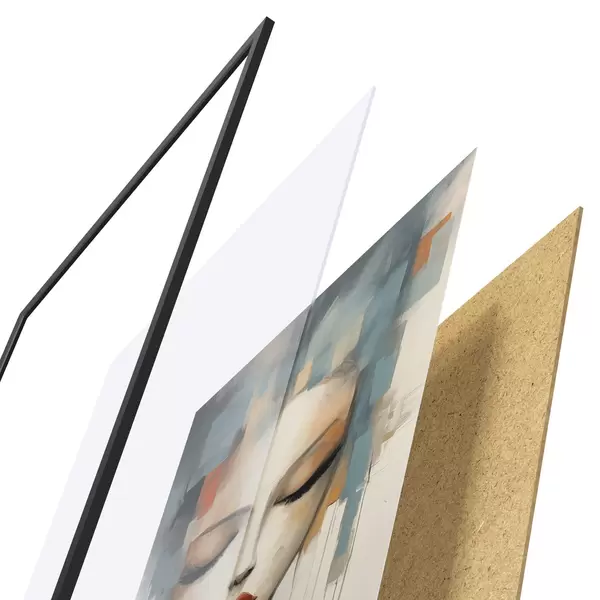 De poster bestaat uit een frame, plexiglas, geprinte afbeelding en spaanplaat achterkant. De poster kan meteen aan de muur worden gehangen dankzij de bevestigingen op de achterkant.