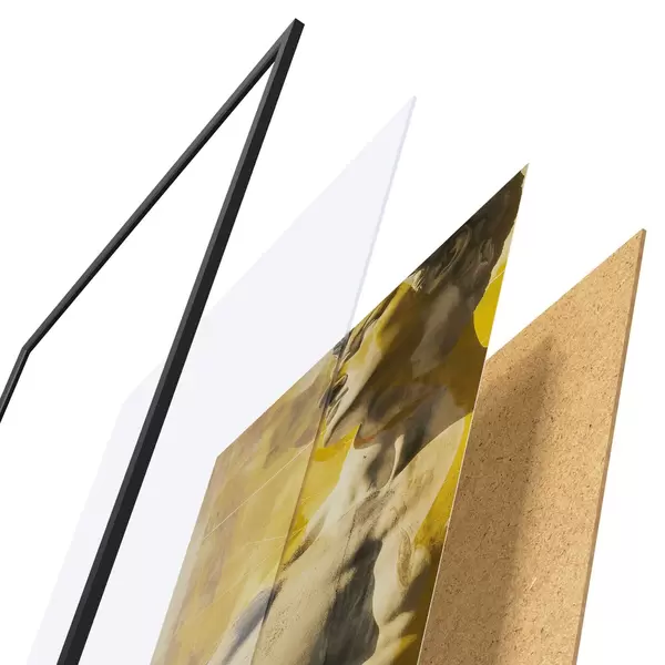 De poster bestaat uit een frame, plexiglas, geprinte afbeelding en spaanplaat achterkant. De poster kan meteen aan de muur worden gehangen dankzij de bevestigingen op de achterkant.