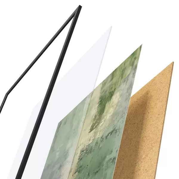De poster bestaat uit een frame, plexiglas, geprinte afbeelding en spaanplaat achterkant. De poster kan meteen aan de muur worden gehangen dankzij de bevestigingen op de achterkant.