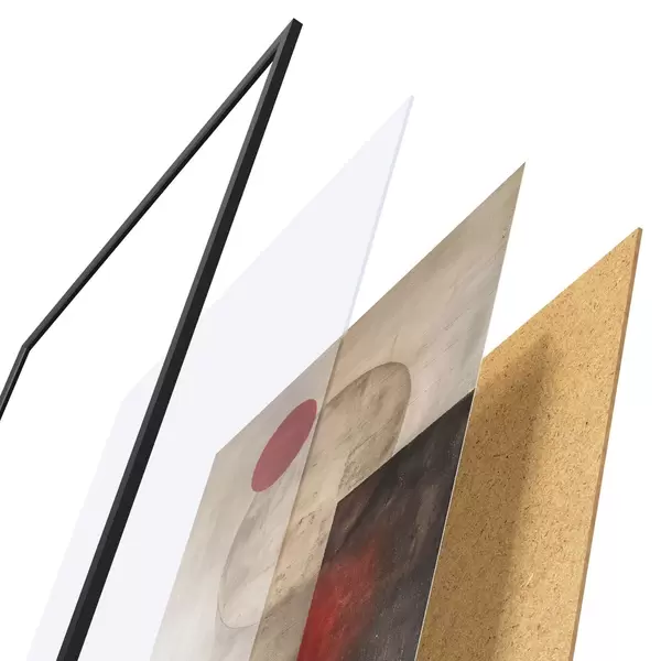 De poster bestaat uit een frame, plexiglas, geprinte afbeelding en spaanplaat achterkant. De poster kan meteen aan de muur worden gehangen dankzij de bevestigingen op de achterkant.