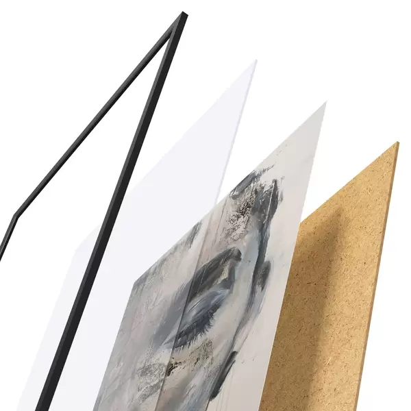 De poster bestaat uit een frame, plexiglas, geprinte afbeelding en spaanplaat achterkant. De poster kan meteen aan de muur worden gehangen dankzij de bevestigingen op de achterkant.