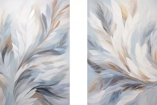 Poster Abstract schilderij van veren in tinten wit, blauw en bruin, met een zachte, vloeiende textuur en een lichte achtergrond. d01234