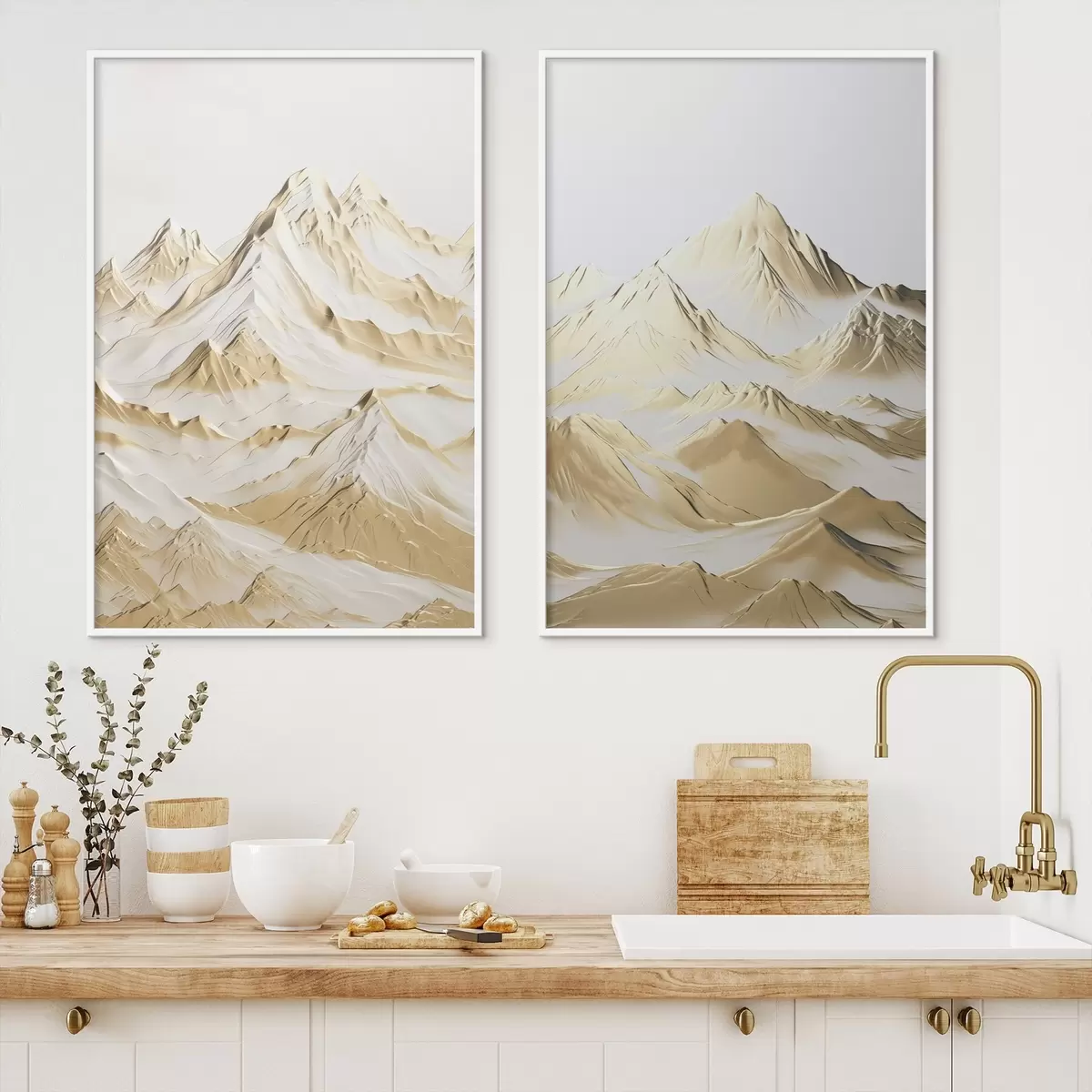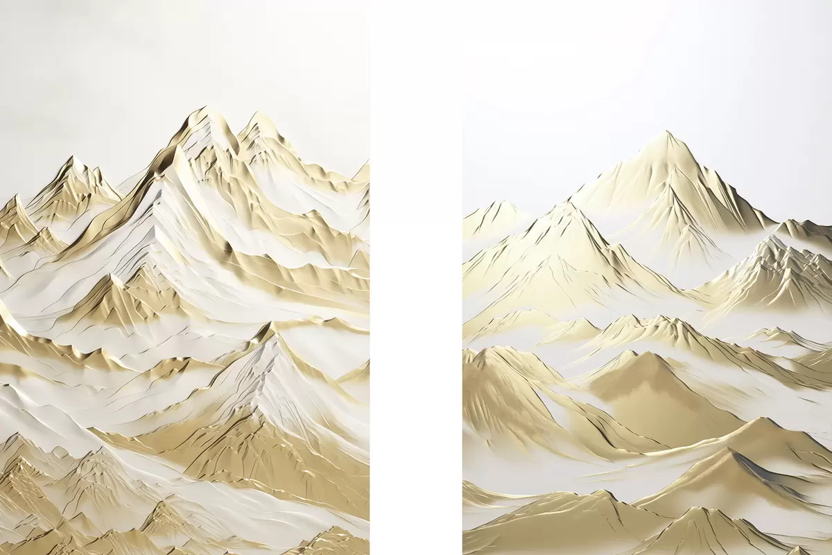 Poster Een landschap van gele, met sneeuw bedekte bergen met scherpe toppen en diepe valleien onder een heldere hemel. N° d01236