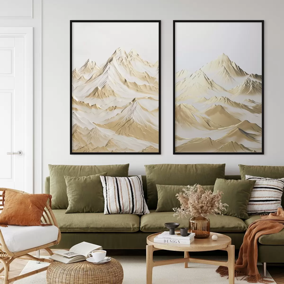 Poster Een landschap van gele, met sneeuw bedekte bergen met scherpe toppen en diepe valleien onder een heldere hemel. d01236