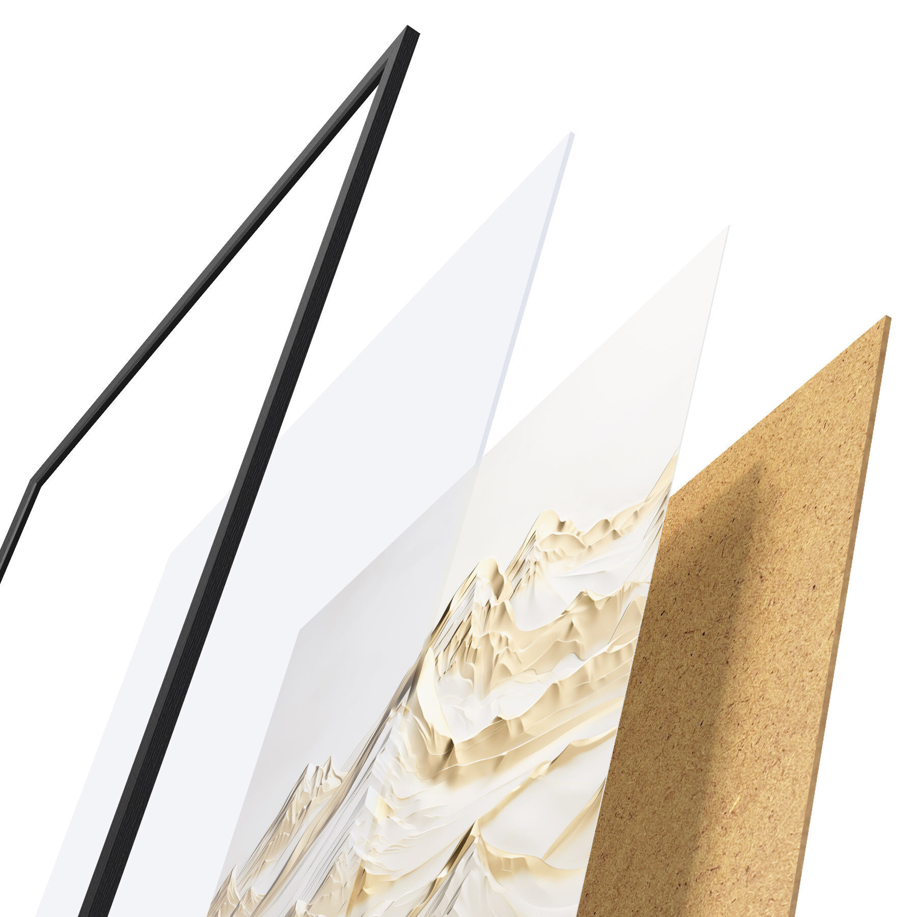 De poster bestaat uit een frame, plexiglas, geprinte afbeelding en spaanplaat achterkant. De poster kan meteen aan de muur worden gehangen dankzij de bevestigingen op de achterkant.
