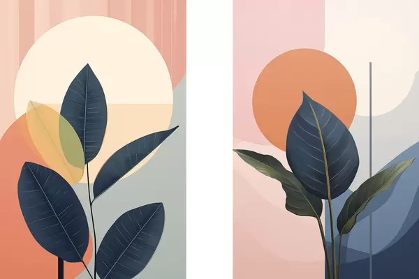Poster Donkere bladeren tegen een achtergrond van abstracte vormen in perzik en grijs met een grote, lichtgele cirkel N° d01238