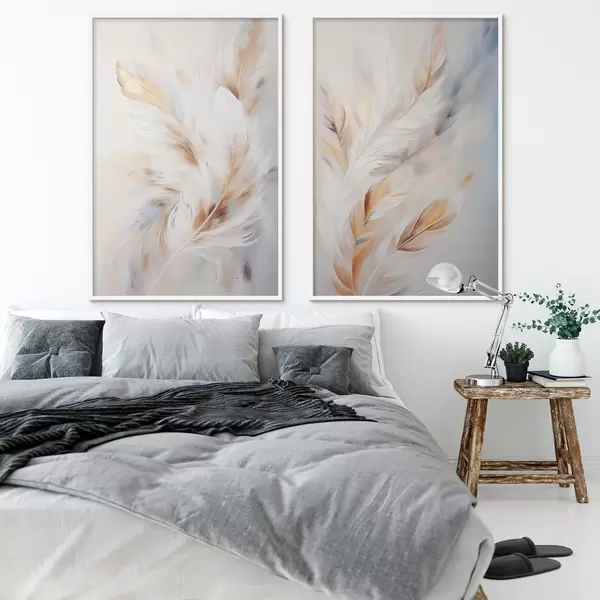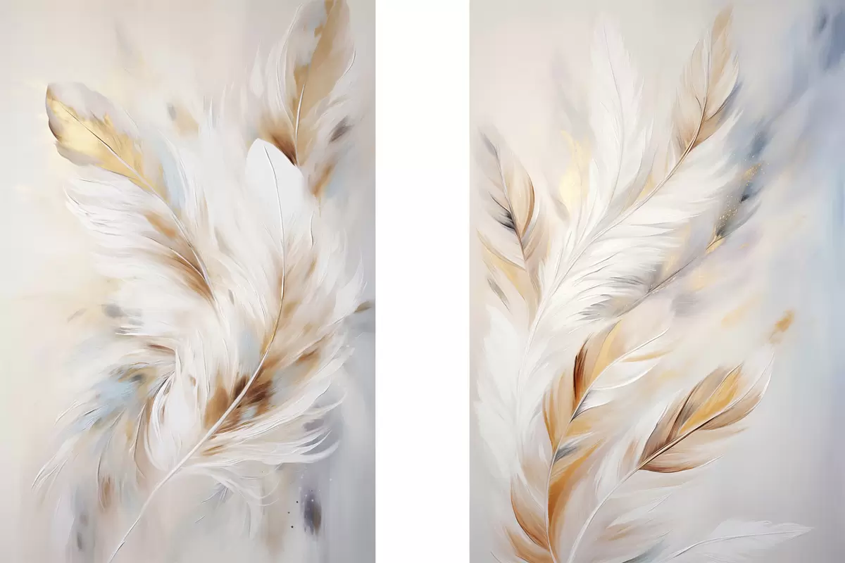 Poster Grote, zachte veren met een mix van witte, gele en bruine tinten, tegen een lichte, abstracte achtergrond. d01247