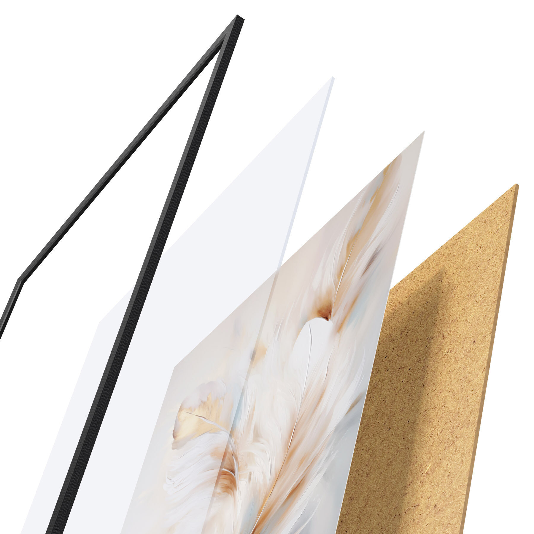 Poster Grote, zachte veren met een mix van witte, gele en bruine tinten, tegen een lichte, abstracte achtergrond. N° d01247