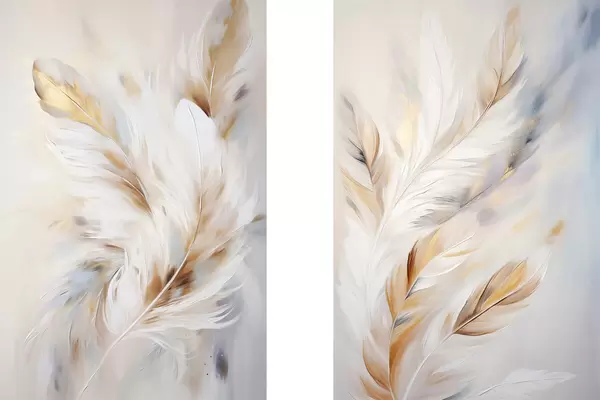 Poster Grote, zachte veren met een mix van witte, gele en bruine tinten, tegen een lichte, abstracte achtergrond. d01247