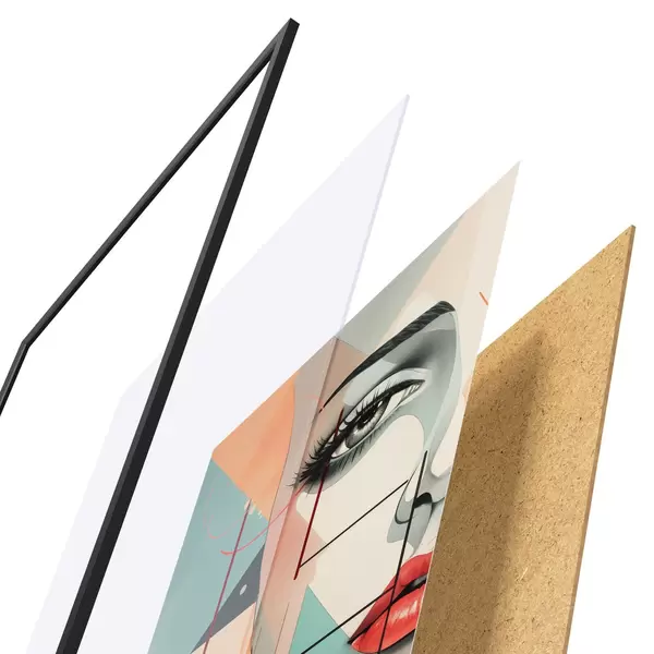 De poster bestaat uit een frame, plexiglas, geprinte afbeelding en spaanplaat achterkant. De poster kan meteen aan de muur worden gehangen dankzij de bevestigingen op de achterkant.