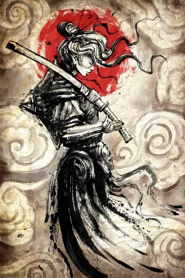 Poster Mooi samoerai meisje met een katana op haar schouder N° f33060