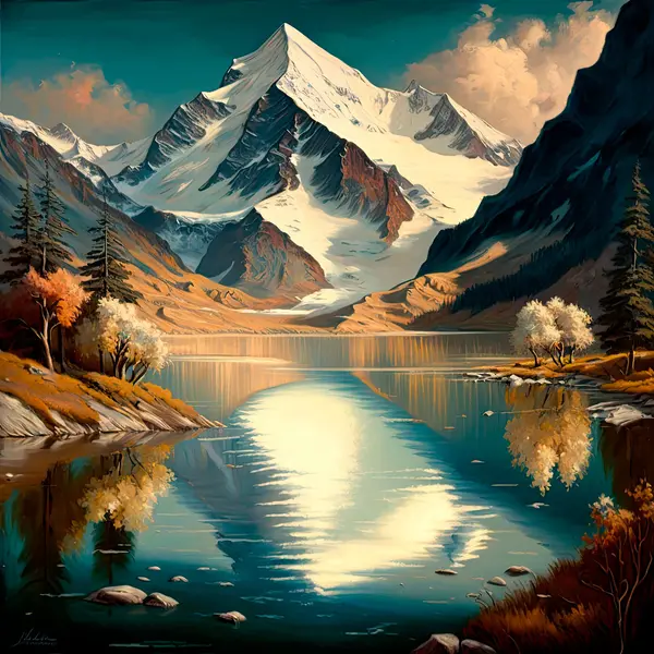 Poster Olieverfschilderij van een berg gemaakt van bomen en sneeuw f34631