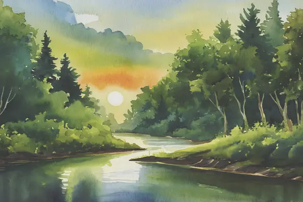 Poster Zonsondergang op de rivier, bos, aquarel, zonsondergang, groen, natuur N° f37949