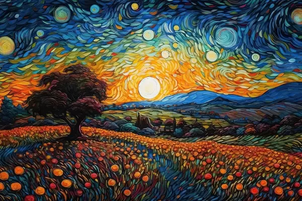 Poster Levendige zonsondergang over bloeiende velden N° f38059