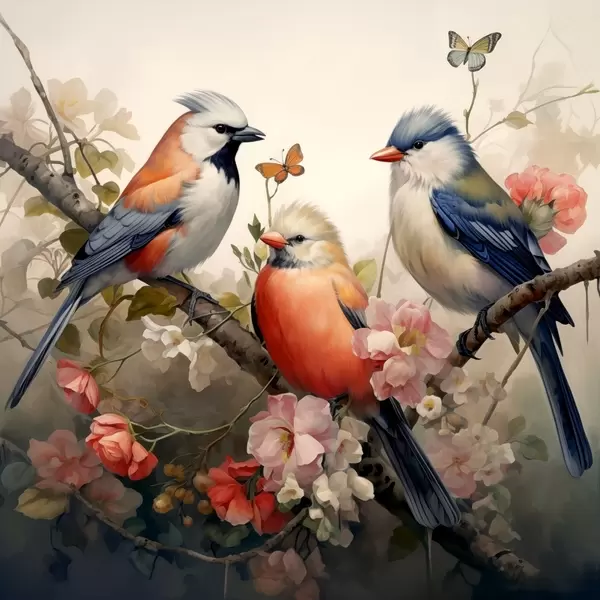Poster Groep vogels op een tak met bloemen N° f38103