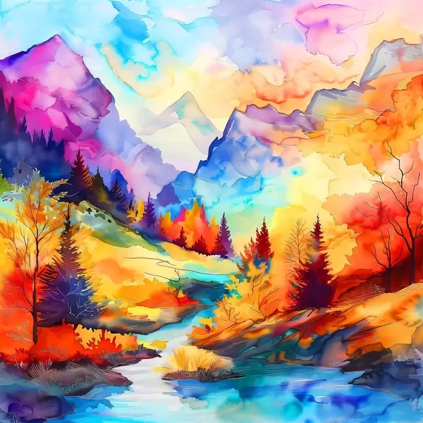 Poster Kleurrijk berglandschap met bomen en rivier N° f38145
