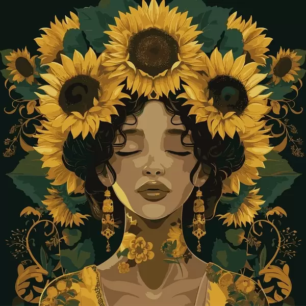 Poster Vrouw met zonnebloemen in haar haar N° f38263