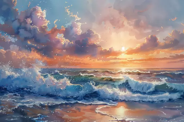 Poster Zonsondergang tegen de achtergrond van golven N° f38474