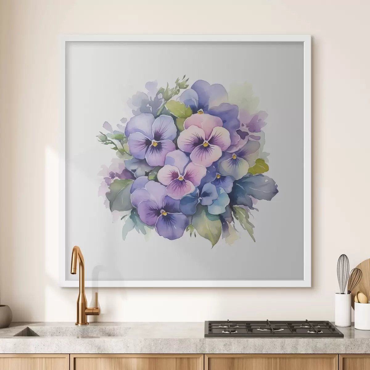 Poster Viooltjes aquarel illustratie, boeket, bloemen, blauwe, paarse, groene kleur N° f38486