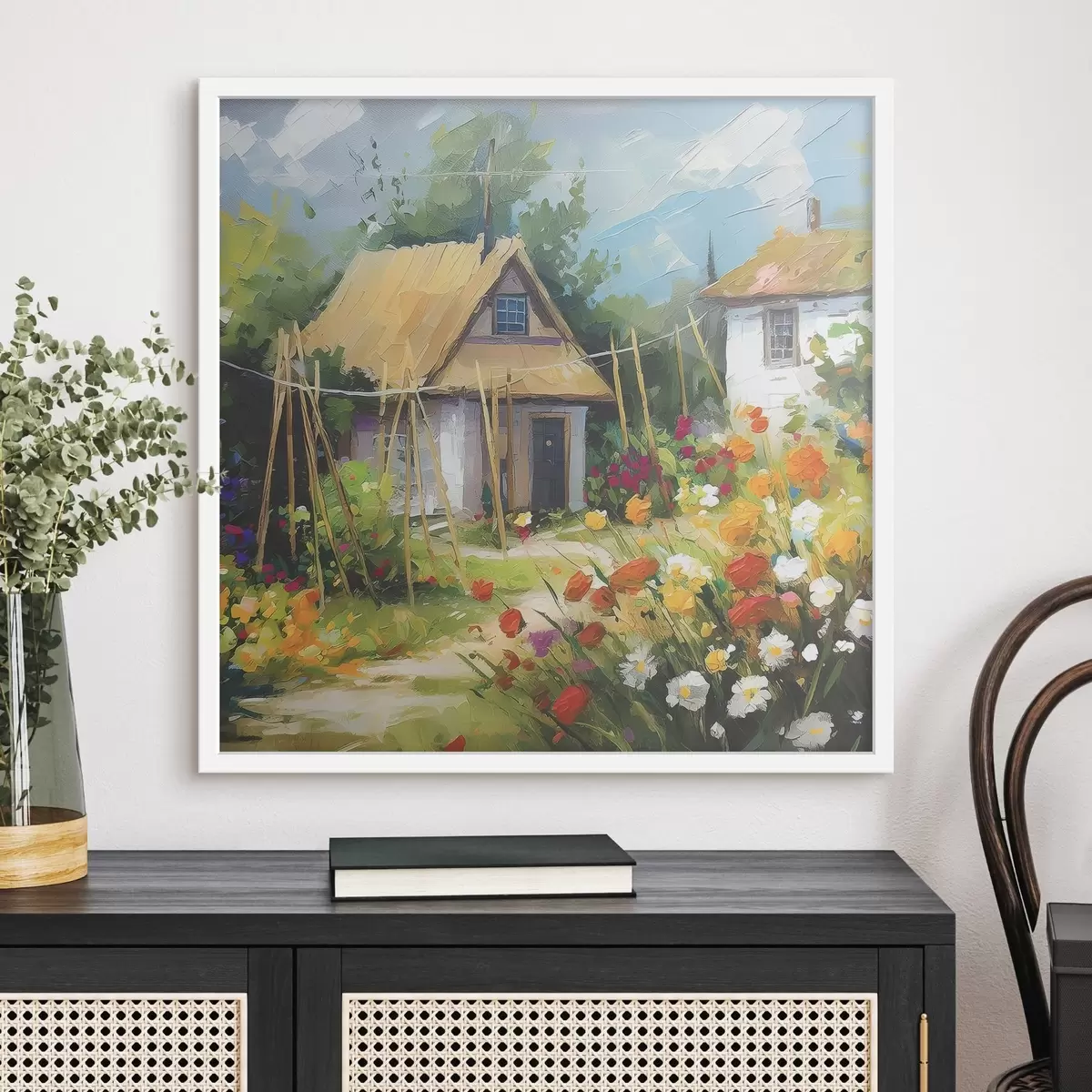 Poster Zomertuin met bloemen, landhuis, blauwe lucht, olieverf penseelstreken N° f38494