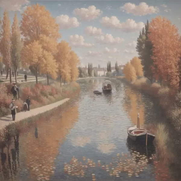 Poster Afbeelding van een rivier met boten en mensen. f38598