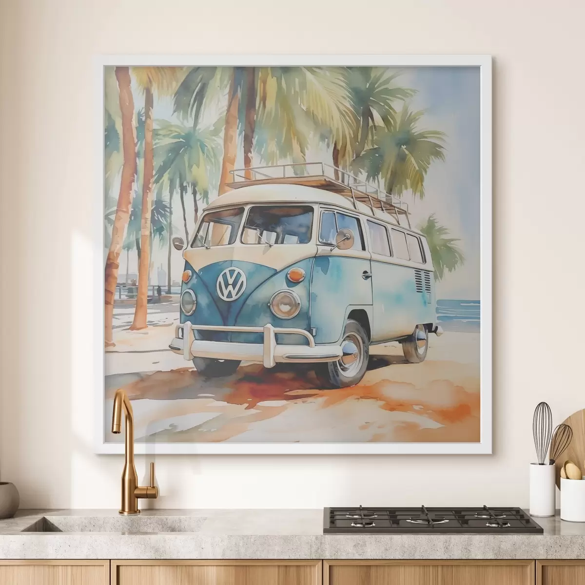 Poster Een reisauto staat geparkeerd op het strand tegen een achtergrond van aquarelpalmbomen N° f38911