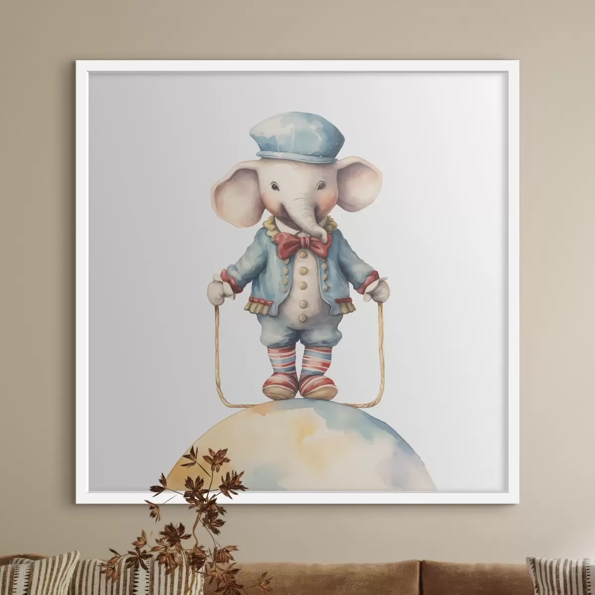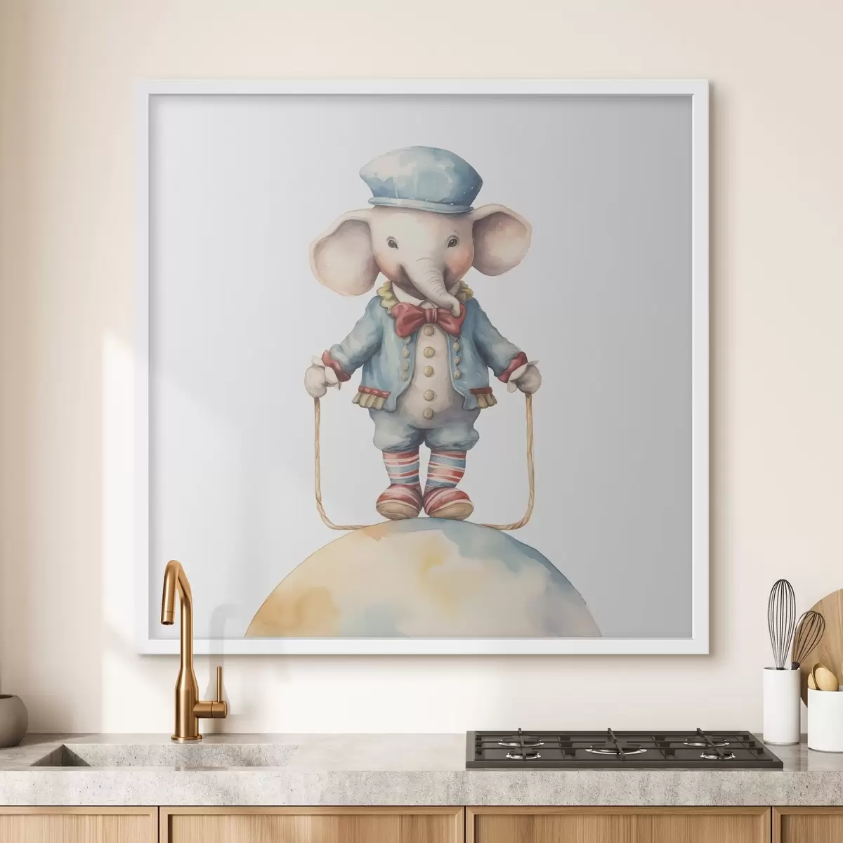 Poster Olifant balanceert op een kleurrijke wereldbol N° f38950