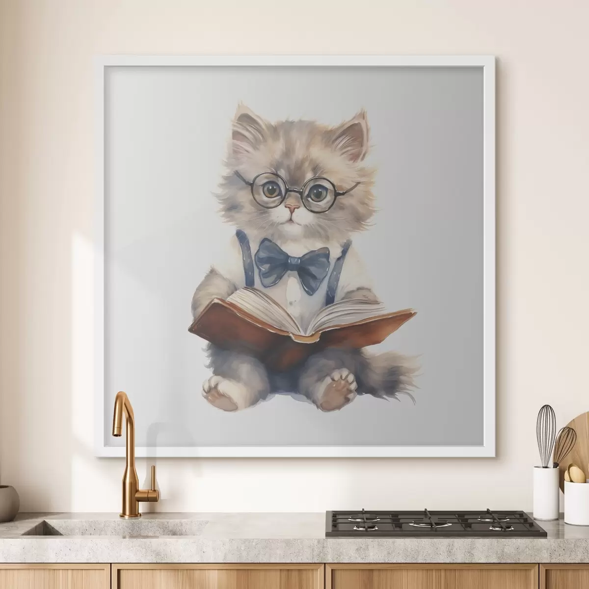 Poster Een grijs katje met een zwarte bril en een blauw pakje leest een boek aquarel f39023
