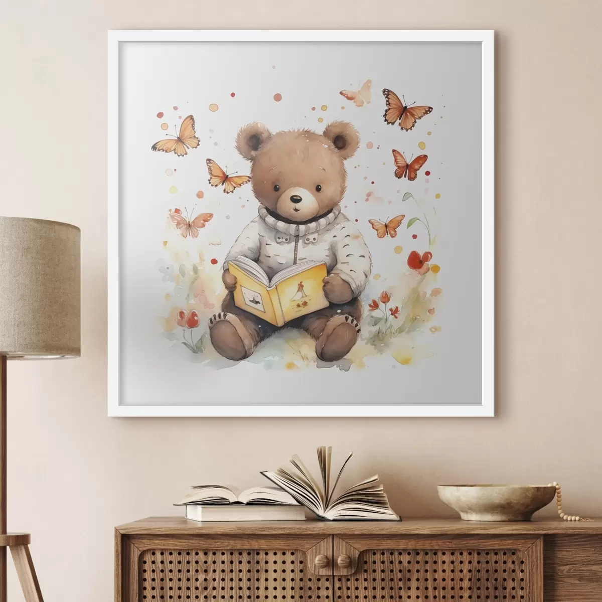 Poster Een bruine beer in een trui leest een boek omringd door waterverf vlinders N° f39025