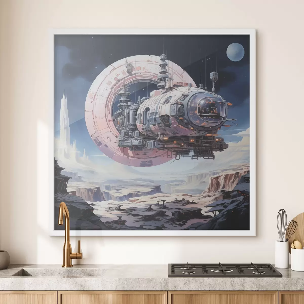 Poster Cyberpunk stijl ruimteschip vliegt in de ruimte over asteroïde en planeet, blauw, beige, roze, witte kleur N° f39115