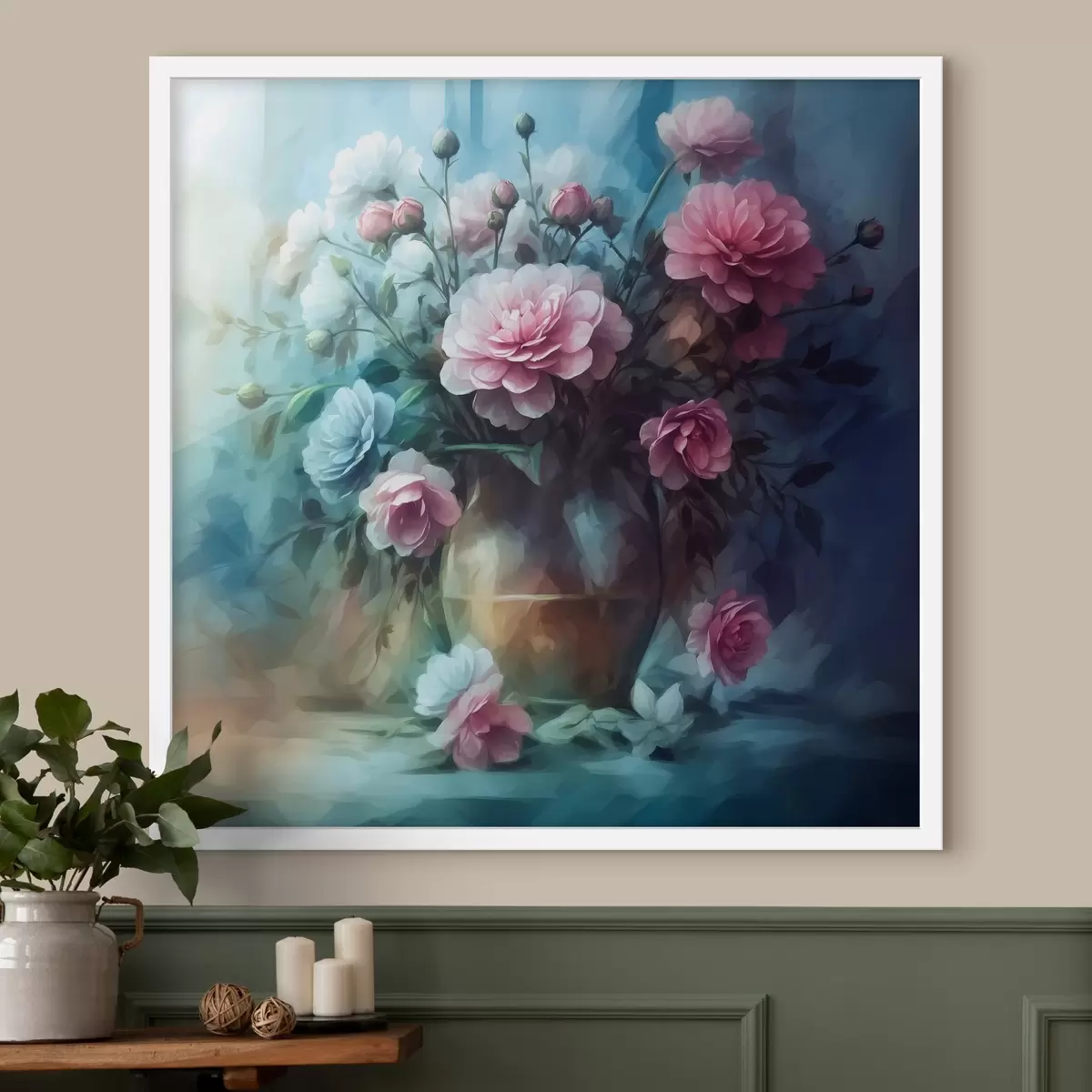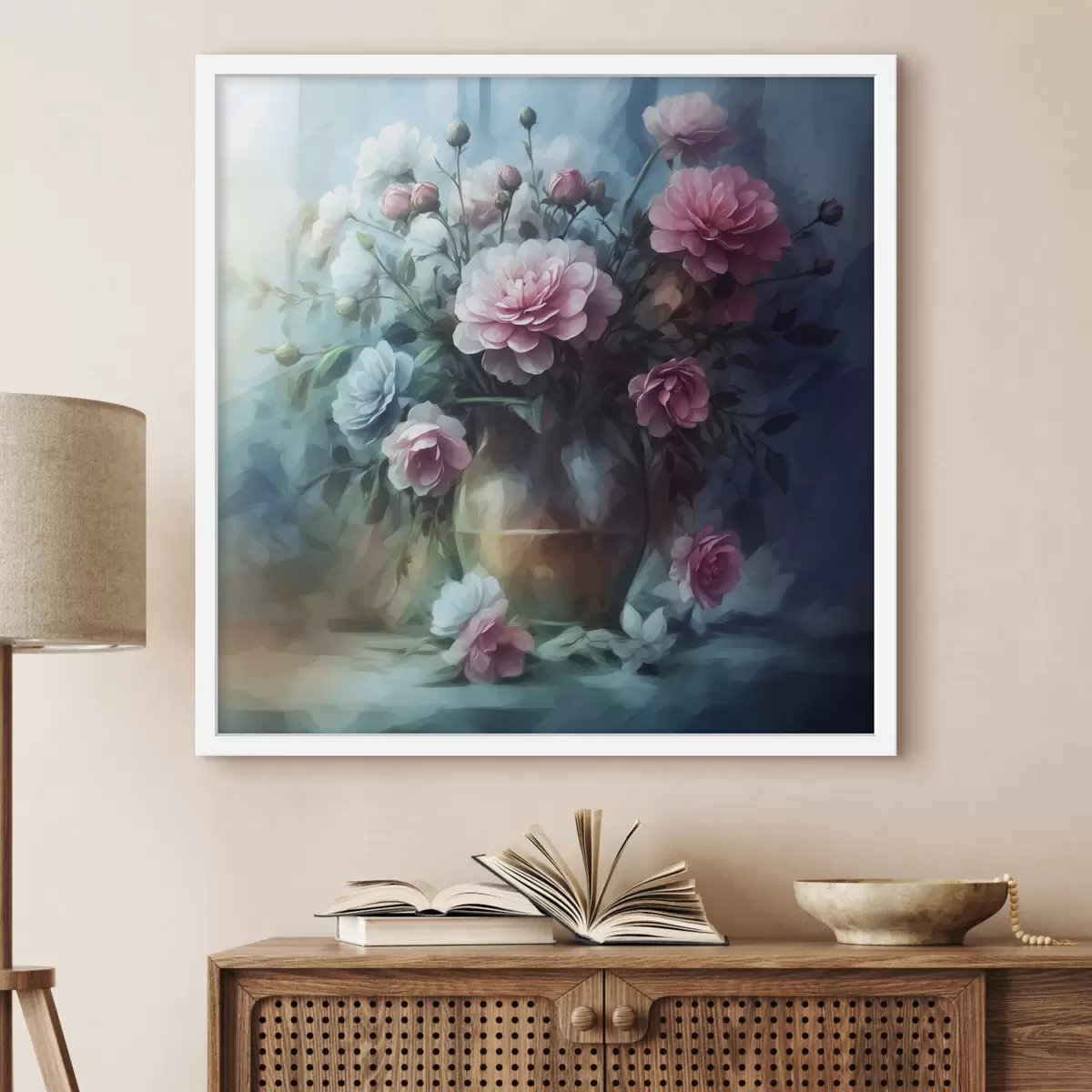 Poster Bloemen in een vaas op een wolkenblauwe achtergrond N° f39164