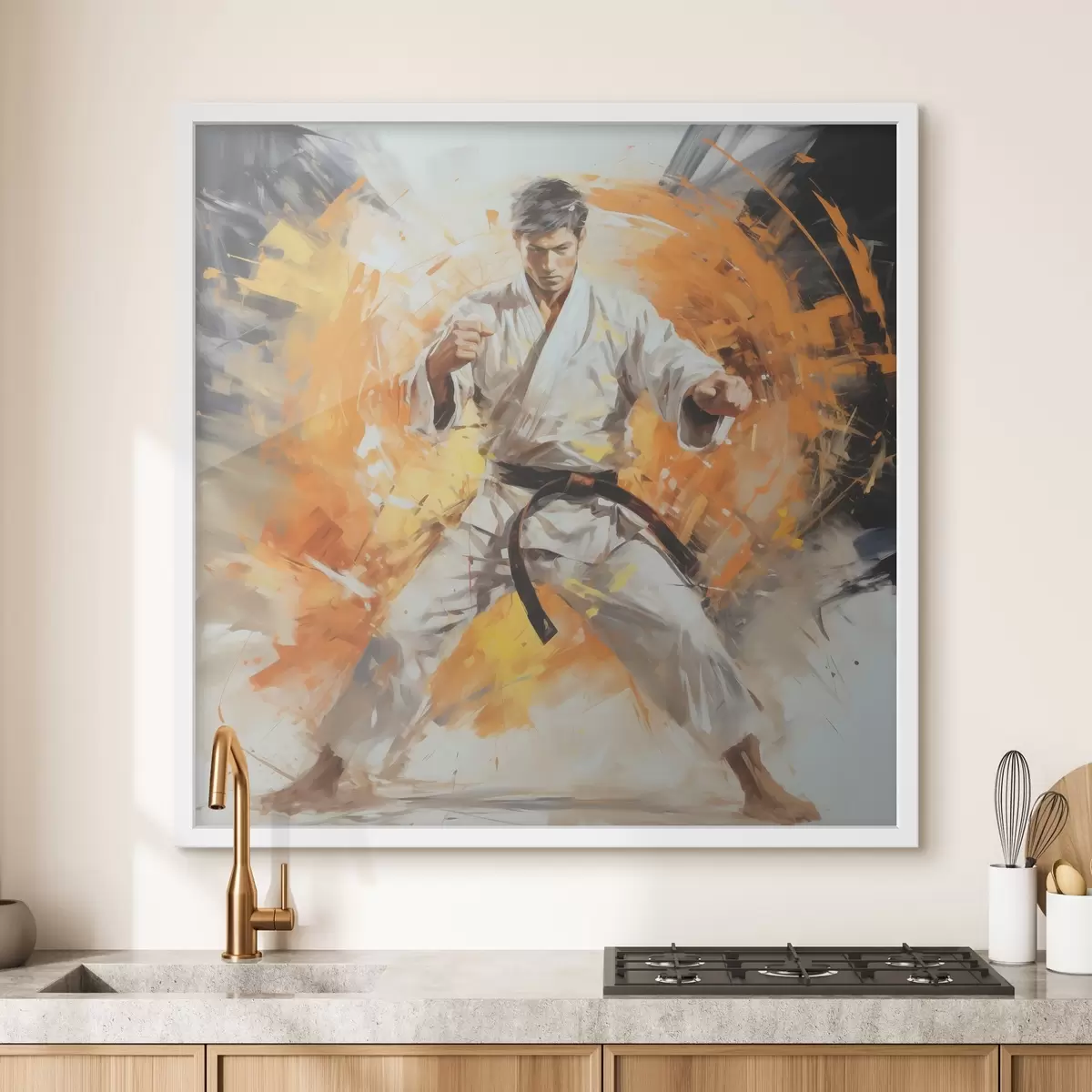 Poster Karateka in een wit pak met een zwarte band olieverfschilderij abstracte kunst, oranje en zwarte kleur N° f39185