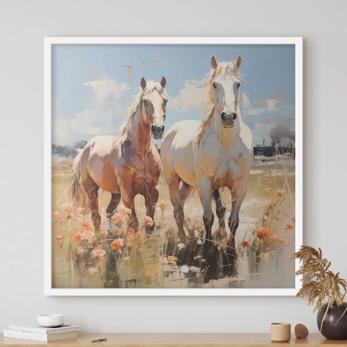 Poster Witte en bruine paarden grazen in een weide tussen wilde bloemen, olieverfschilderij, abstracte kunst N° f39187