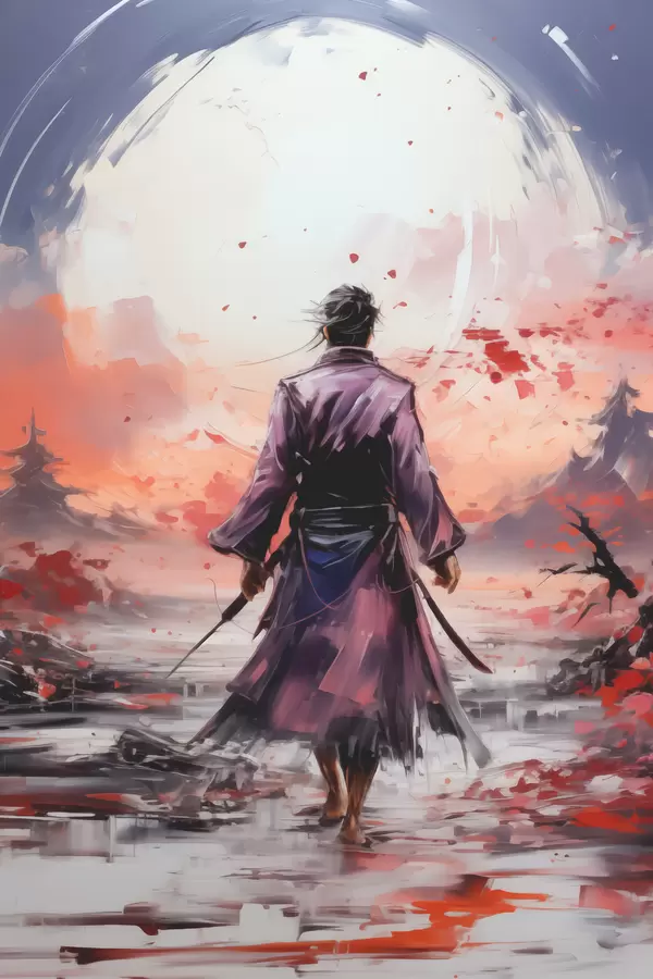 Poster Een samurai met een zwaard in een paarse mantel loopt richting het abstracte kunstschilderij van de bergen N° f39194