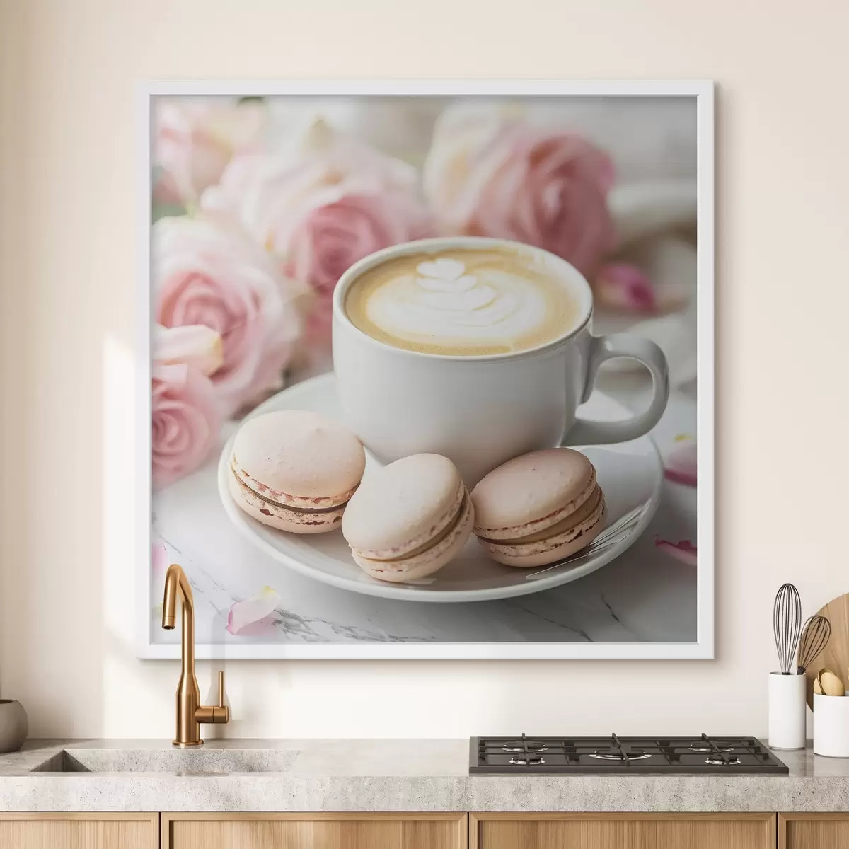 Poster Een kopje koffie op een delicate bloemenachtergrond f39232