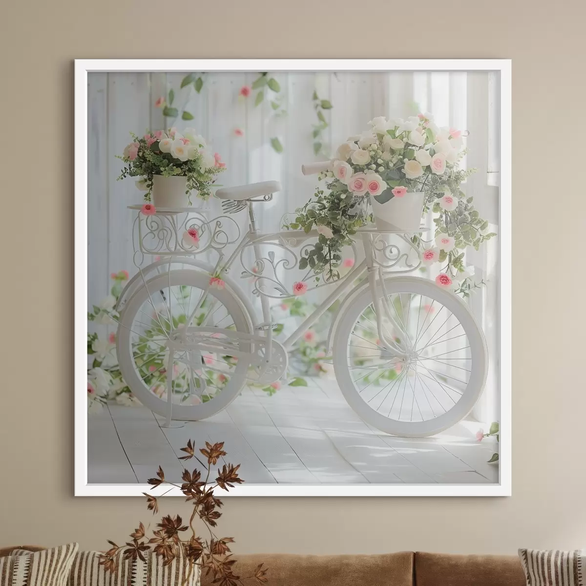 Poster Witte fiets met bloemenmand in Provençaalse stijl N° f39243