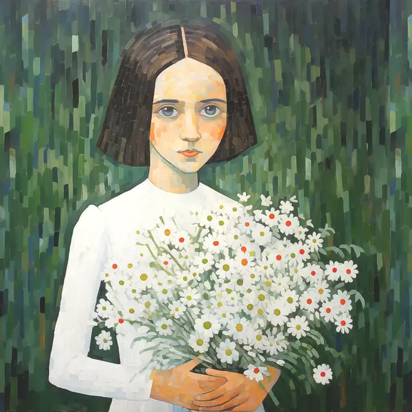 Poster Een meisje in een witte jurk met een boeket witte madeliefjes in haar handen op een groene achtergrond f39328