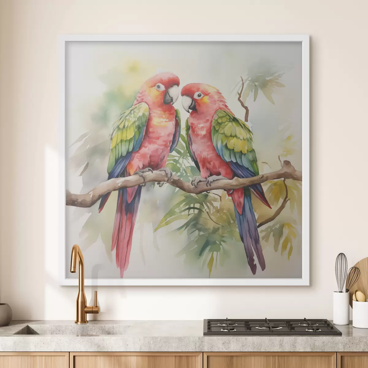 Poster Twee heldere ara papegaaien zittend op een aquarel schilderij op een tak N° f39333