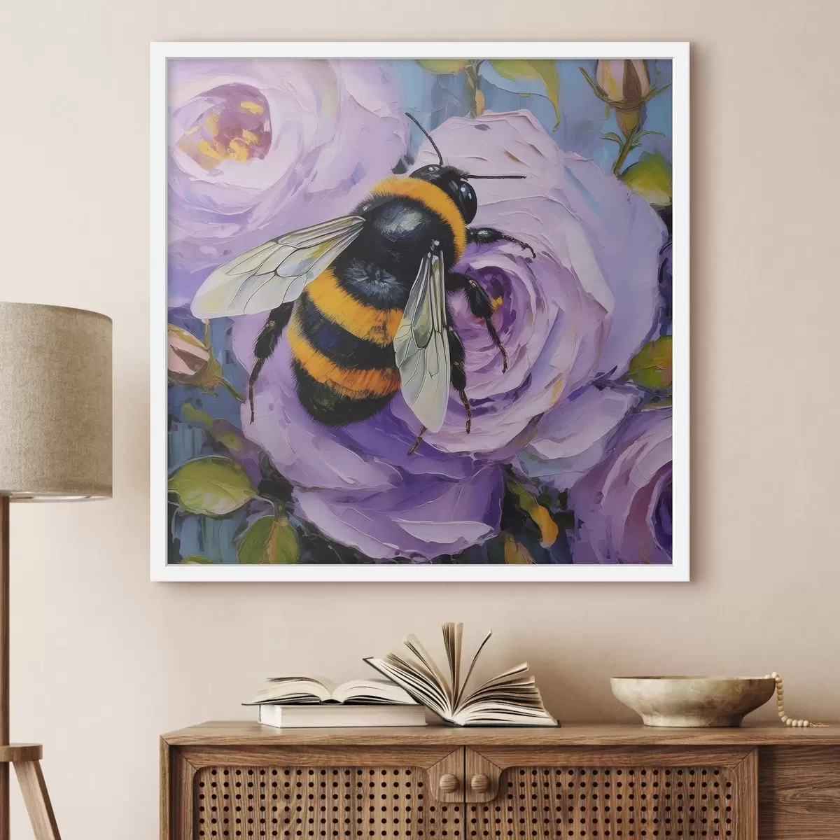 Poster Bij op roze pioenrozen, zomerbloemen, olieverfschilderij, levendige penseelstreken N° f39410