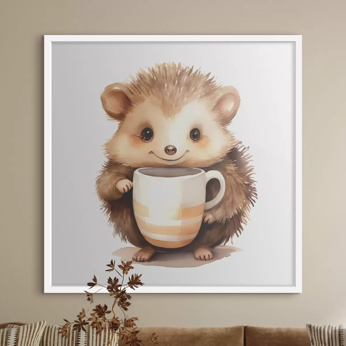 Poster Egel met een wit kopje in zijn poten aquarel illustratie voor kinderen N° f39440