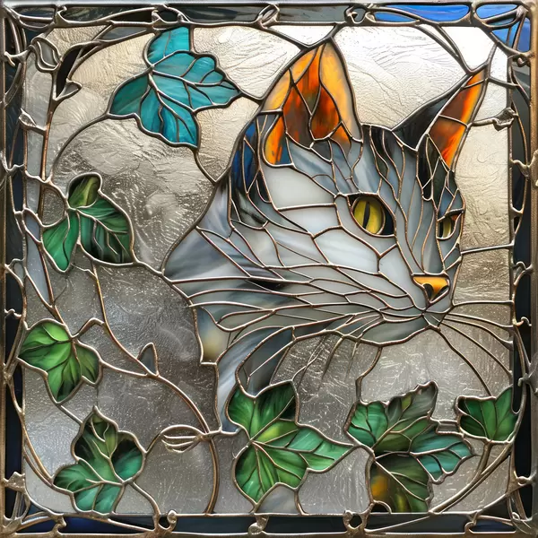 Poster Gebrandschilderd glas geïnspireerd kunstwerk: kat tussen herfstbladeren N° f39448