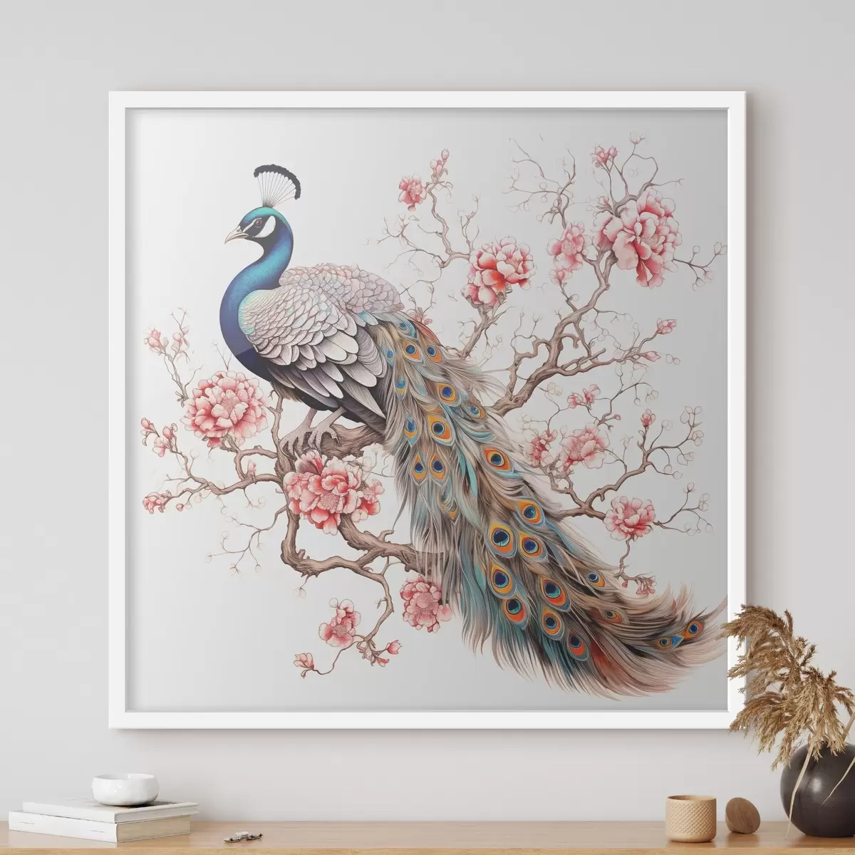 Poster Een pauw zit op een waterverf sakura tak N° f39568
