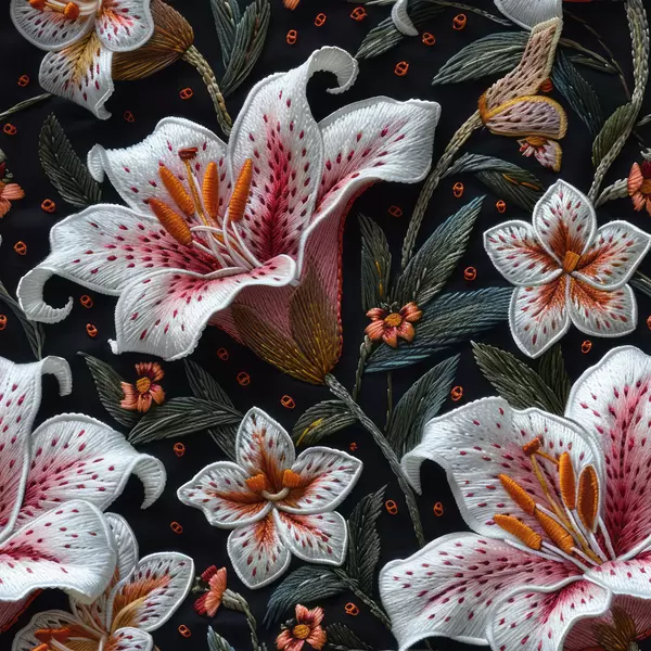 Poster Stompwerkborduurwerk: bloeiende lelies in zwart draad op sierlijke stof met een tweekleurenpalet N° f39649