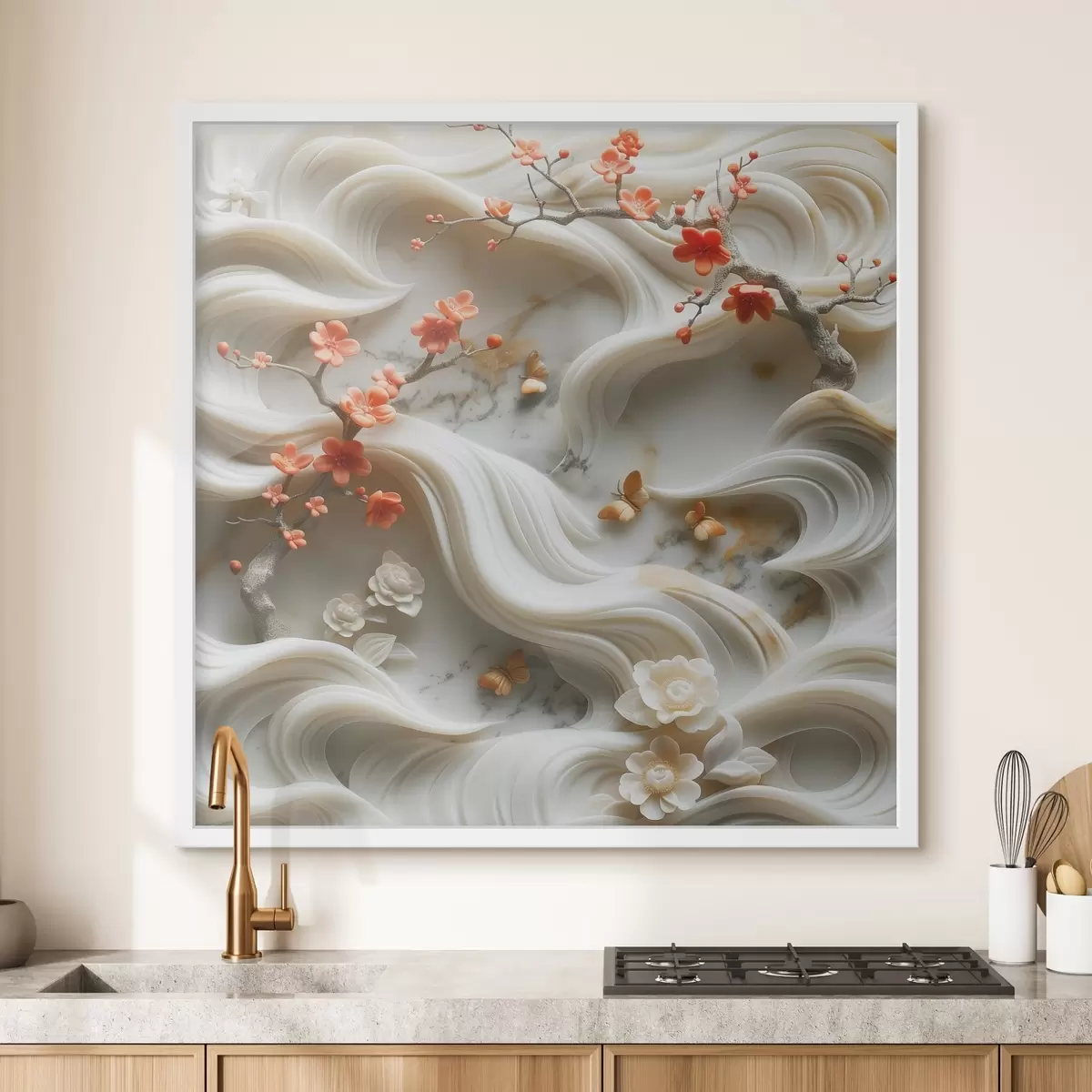 Poster Een hemels 3D-tuinscène uitgesneden in wit marmer met vloeiende flora en fauna f39727