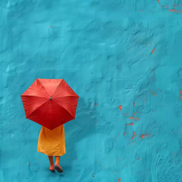 Poster Minimalistisch beeld van een meisje in het geel met een paraplu bij een muur N° f39731