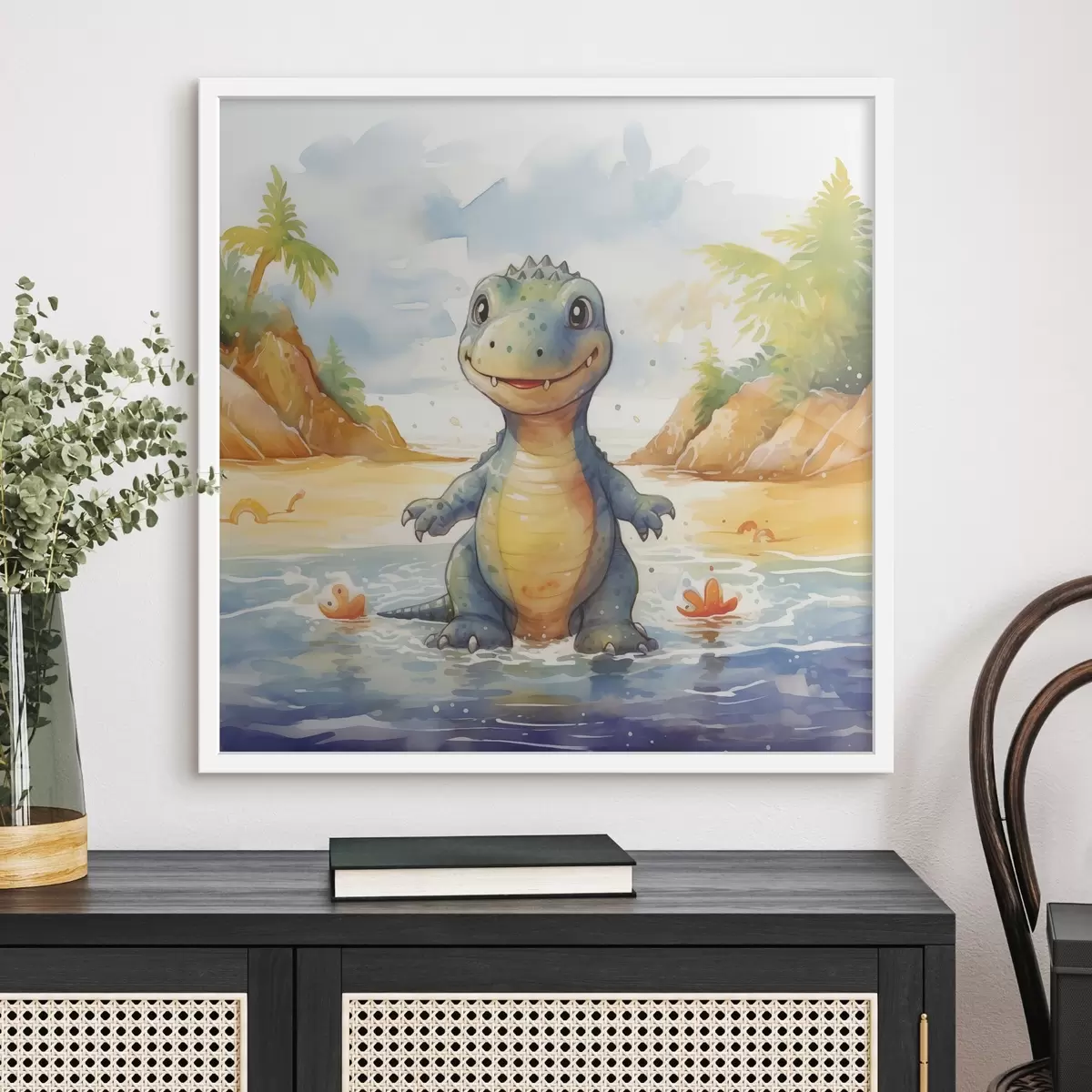 Poster Dinosaurus in de rivier op de achtergrond van bergen en aquarelvarens N° f39930